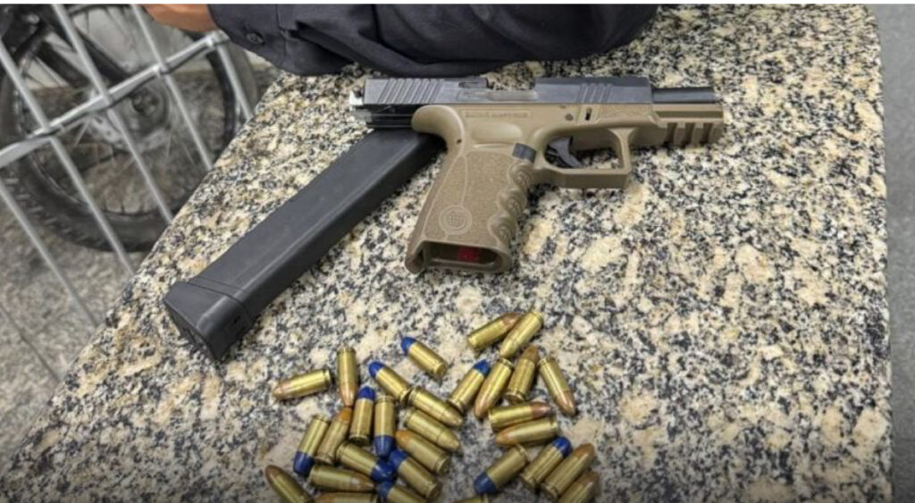 Após deter o homem, os policiais realizaram uma varredura na área e localizaram uma pistola calibre 9 milímetros, com um kit rajada e com a numeração raspada.